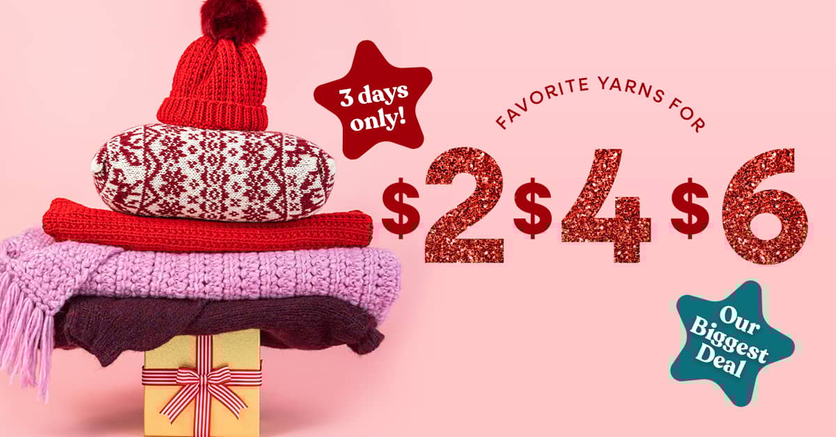 Hey, there! My favorite yarn sale of the year has just started, and some of the best deals are running right now... My favorite deal of the sale is always the $2, $4, and $6 yarn sale, where you can score select yarns as low as $2 per skein! This deal ends November 5th at 11:59pm, and usually, some of the lowest-priced yarns sell out during this part of the sale, so if you see something you like, be sure to grab it while it's still available. SHOP $2, $4, & $6 YARN The rest of the sale...